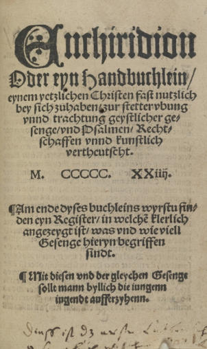 Enchiridion Oder eyn Handbuchlein. Het voorwoord en alle liedteksten van Loersfelds Enchiridion heeft