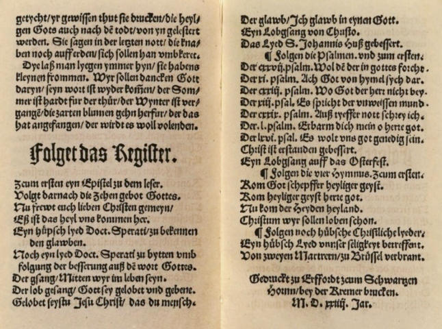 - het Erfurter Enchiridion met 26 liederen van Luther en enkele tijdgenoten.